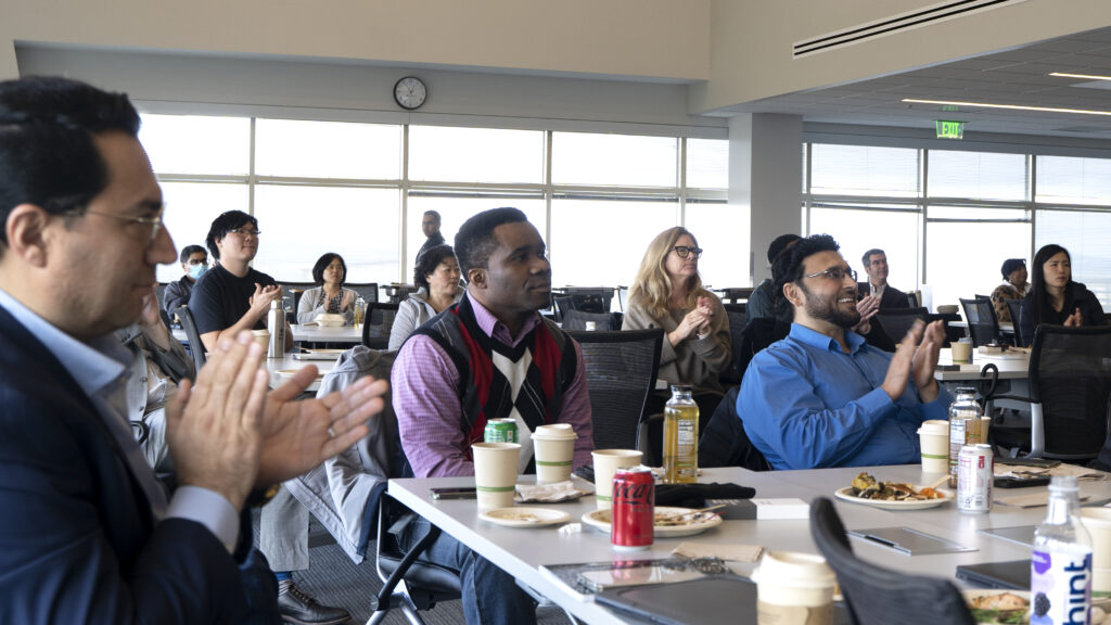 The winners of the completed Hackathon innovative competition the four teams were given awards at a live, hybrid lunch presentation and celebration that took place in early Nov. on campus in Foster City.